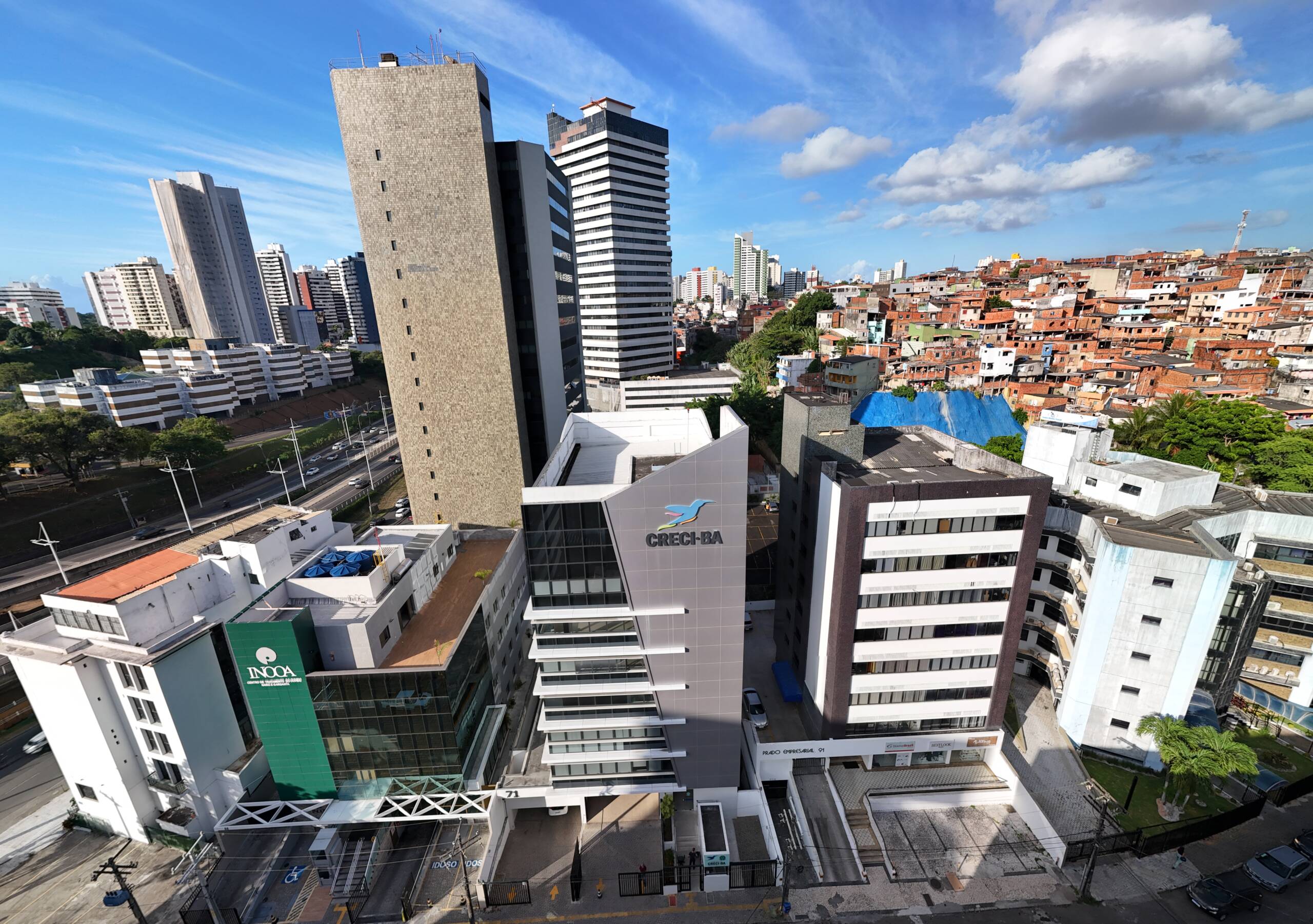 - Estilo: Foto capturada de uma altitude maior, com um ângulo que inclui parte do céu e elementos relevantes do horizonte. O prédio é o ponto focal, mas o olhar é aberto.